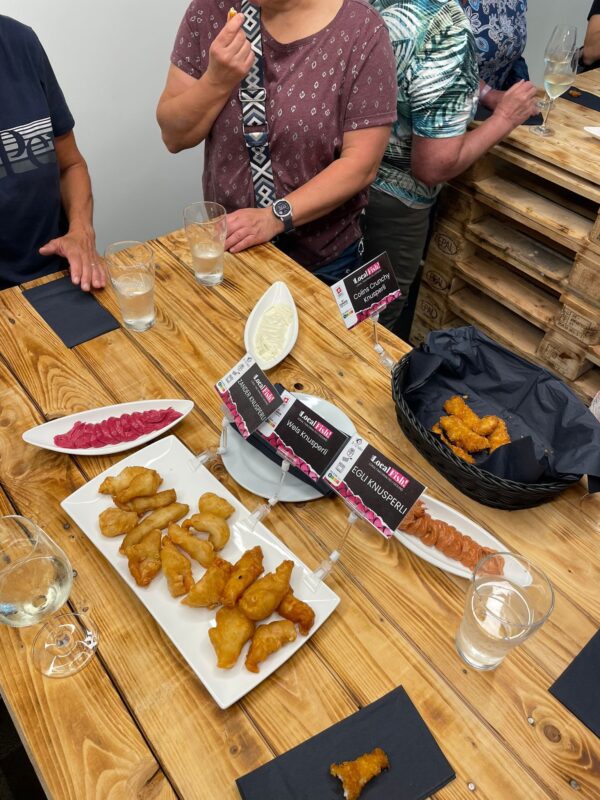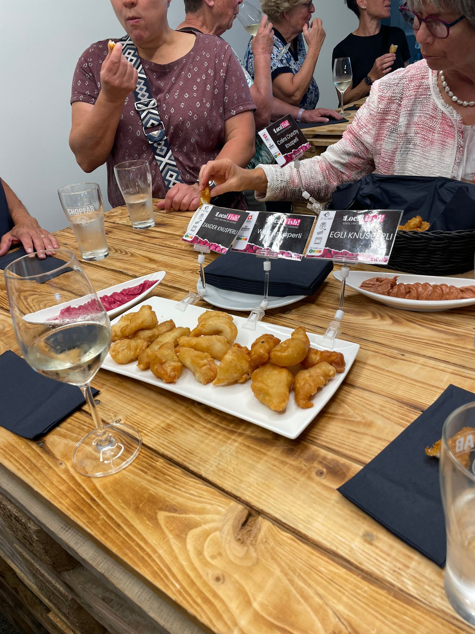 Abschliessend durften wir die diversen Fische als Knusperli mit den hauseigenen Saucen geniessen. Dazu noch ein heimischer Weisswein!