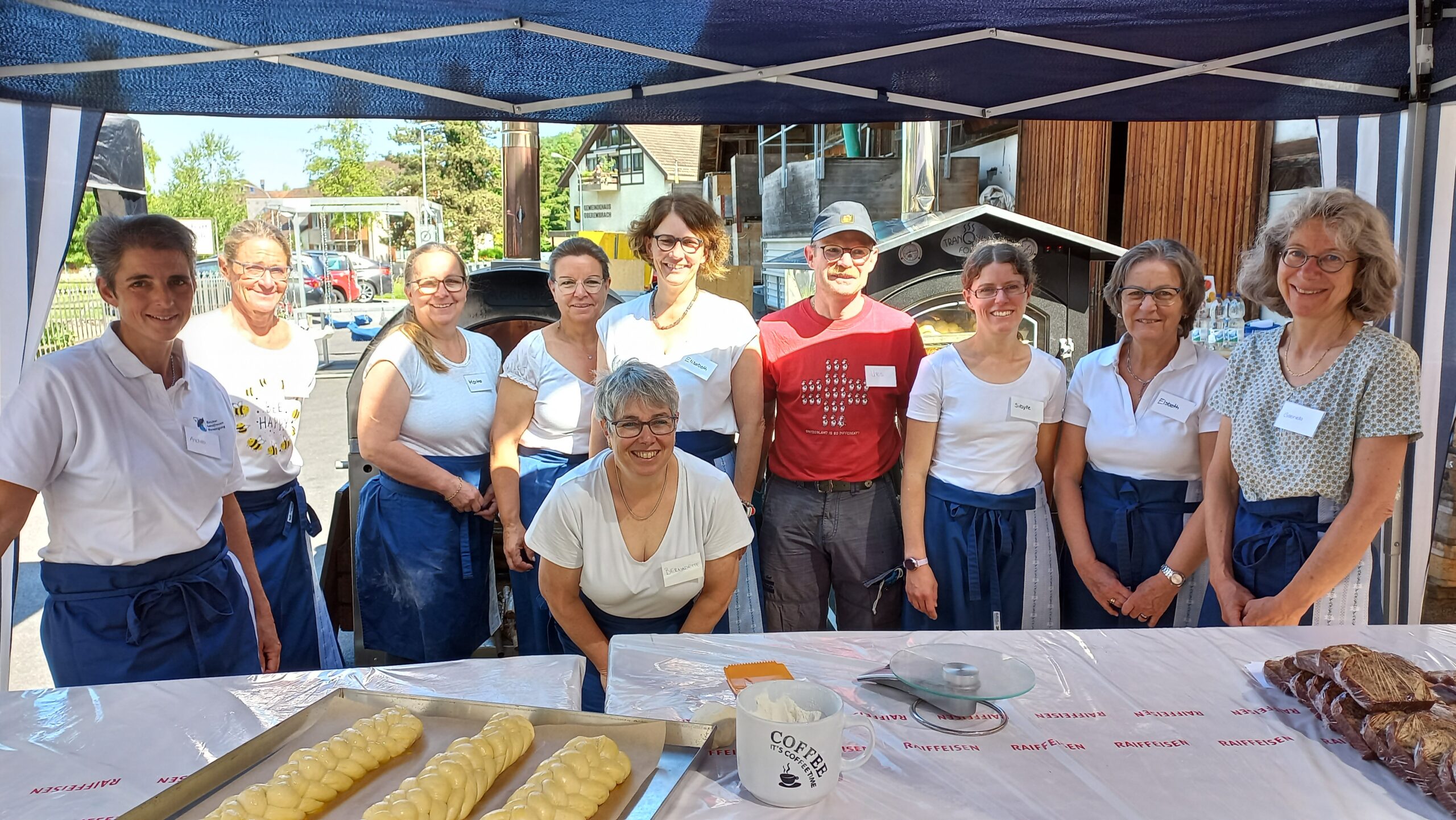 Wieder einmal war Petrus auf unserer Seite. Wir verkauften bei trockenem Wetter ca. 120 Brote, 30 Zöpfe, ca. 100 Chnöpfli/Vogeli/Schogitübli, Konfitüren, Bretzeli, Guetzlisäckli, Amaretti und Erdbeeren.