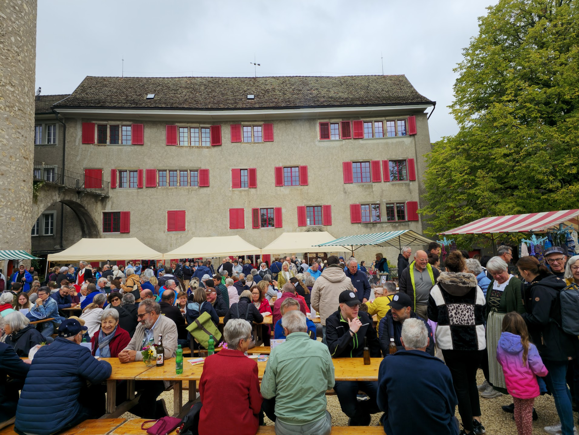 - Traditionell, aber nicht wie immer! – Nach diesem Motto führten wir auch dieses Jahr unseren Herbstmarkt in Regensberg durch. Wer durch den Torbogen beim Obertor kam, sah keine Marktstände, sondern nur unsere Enten, die im Brunnen ihre Kreise zogen. Der Markt fand dieses Jahr auf dem Schlossplatz beim Turm statt, da das Kirchgemeindehaus umgebaut wurde. Im Zentrum standen die Festbänke und ringsum stellten wir die Markt- und Verpflegungsstände auf. Die Trachtentanzgruppe und die Örgelifrau fanden auch noch Platz. Petrus hat wohl unsere Gebete erhört und sorgte für strahlenden Sonnenschein – vorher und nachher hatten wir garstiges Herbstwetter. Die unzähligen Besucher sorgten für eine fröhliche Stimmung. Wer es gerne etwas ruhiger hatte, gönnte sich eine Auszeit am Konzert in der Kirche.