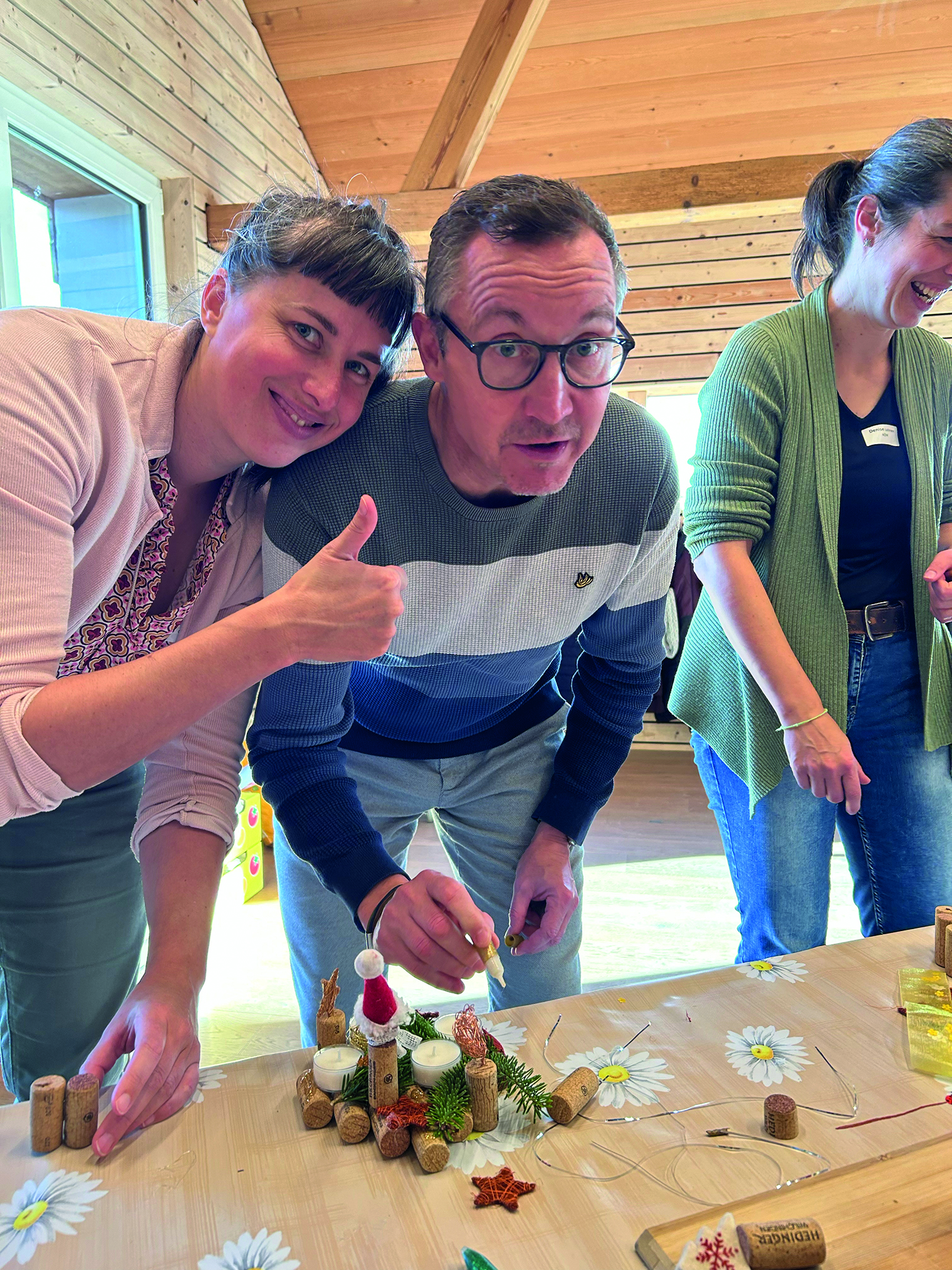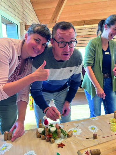 Anschliessend wurde gruppenweise an drei Posten gearbeitet. Getreu dem Motto «Rückblick – Anblick – Ausblick» wurden am Posten 1 Fragen zu unserer Vereinigung diskutiert und die Ergebnisse notiert; sozusagen als Grundlage für die weitere Vorstandsarbeit. Am Posten 2 galt es, aus Korkzapfen, Teelichtern und Dekomaterial ein Windlicht zu basteln. Die handwerkliche Auflockerung kam gut an, es wurde viel gelacht und ganz nebenbei entstanden einige Kunstwerke. Auch Hanu Fehr bastelte fleissig mit… Am Posten 3 fand der gemütliche Teil statt. Bei Kaffee und sehr feinem Russenzopf wurde nach Herzenslust geplaudert und genossen.