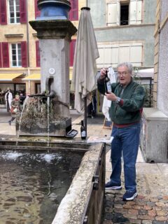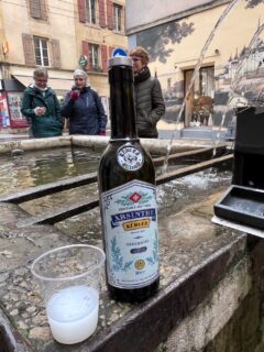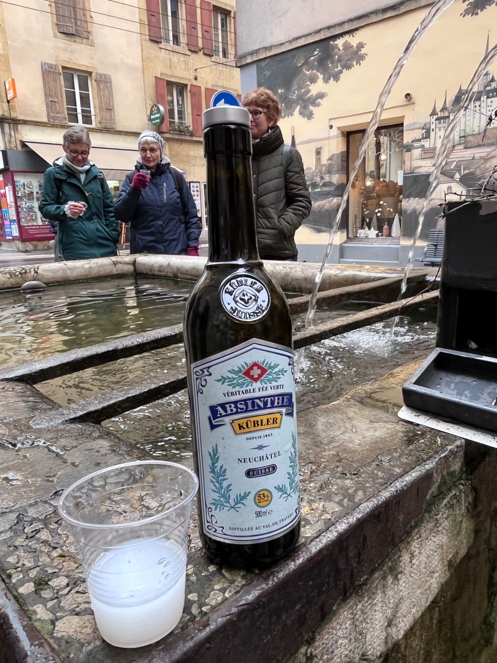 Bei vielen Häusern, Kirchen und auf grösseren und kleineren Plätzen erzählte er Annekdoten über die Stadt, deren Baustil und beantwortet unsere Fragen. Bei einem Brunnen mitten in der Stadt gabs dann plötzlich eine unverhoffte Pause. Aus dem kleinen Metallkästchen am Brunnen zauberte der Führer Absinth-Flaschen hervor und natürlich erhielten alle ein (grosszügiges) «Probiererli». Zuerst klar wie Wasser, verfärbte sich die «grüne Fee» mit etwas Brunnenwasser in ein milchiges Getränk mit immer noch vielen Promille. Nach dem Probieren waren wir uns einig, dass diese Spezialität wohl nicht als Souvenir in den Rucksack zurück nach Zürich muss.