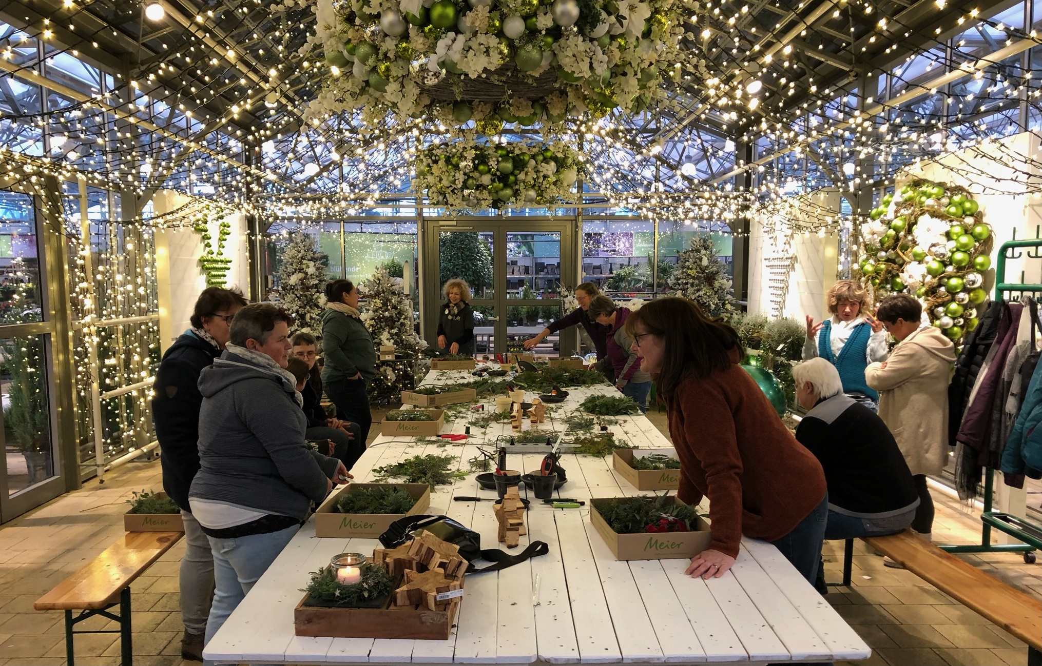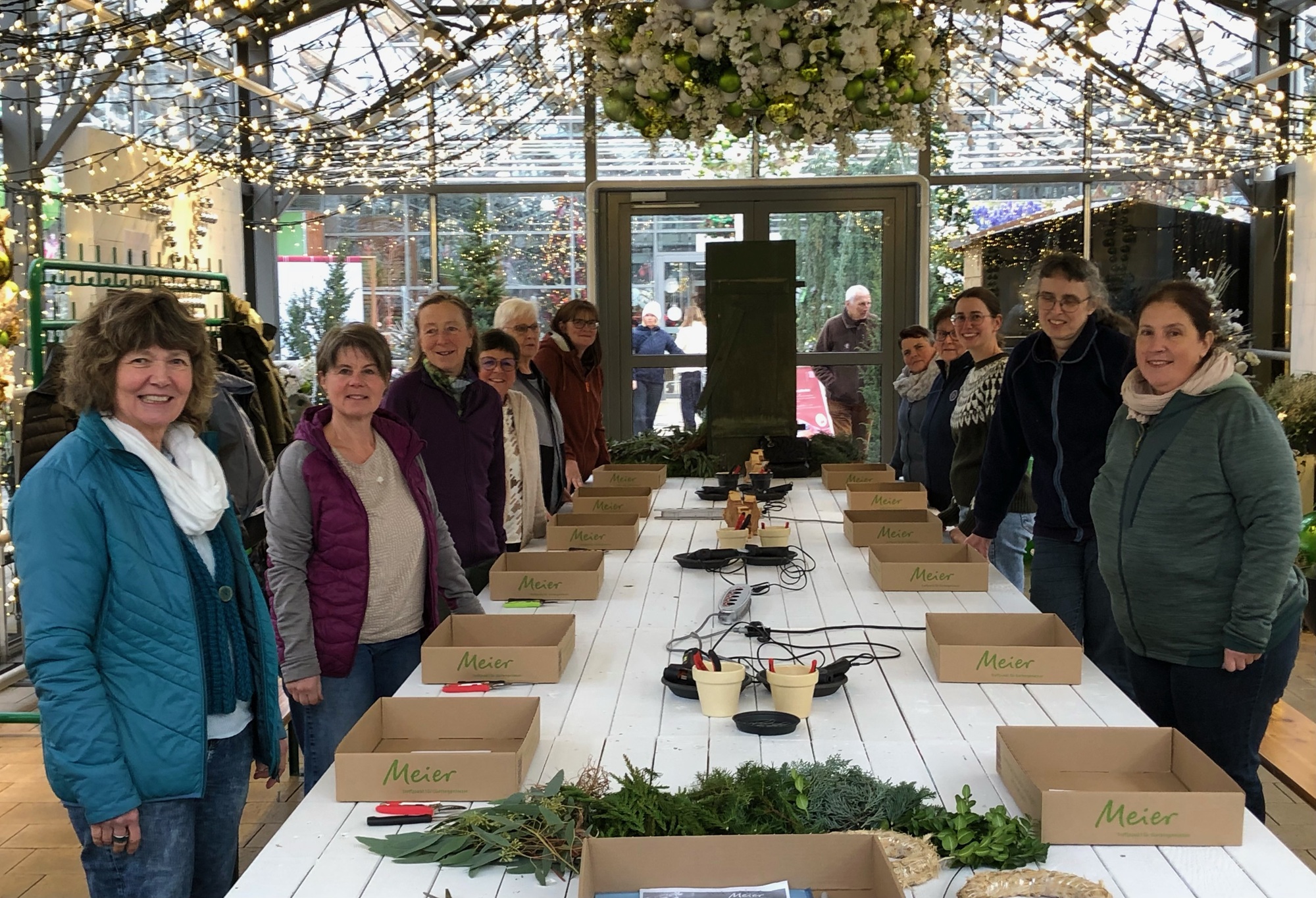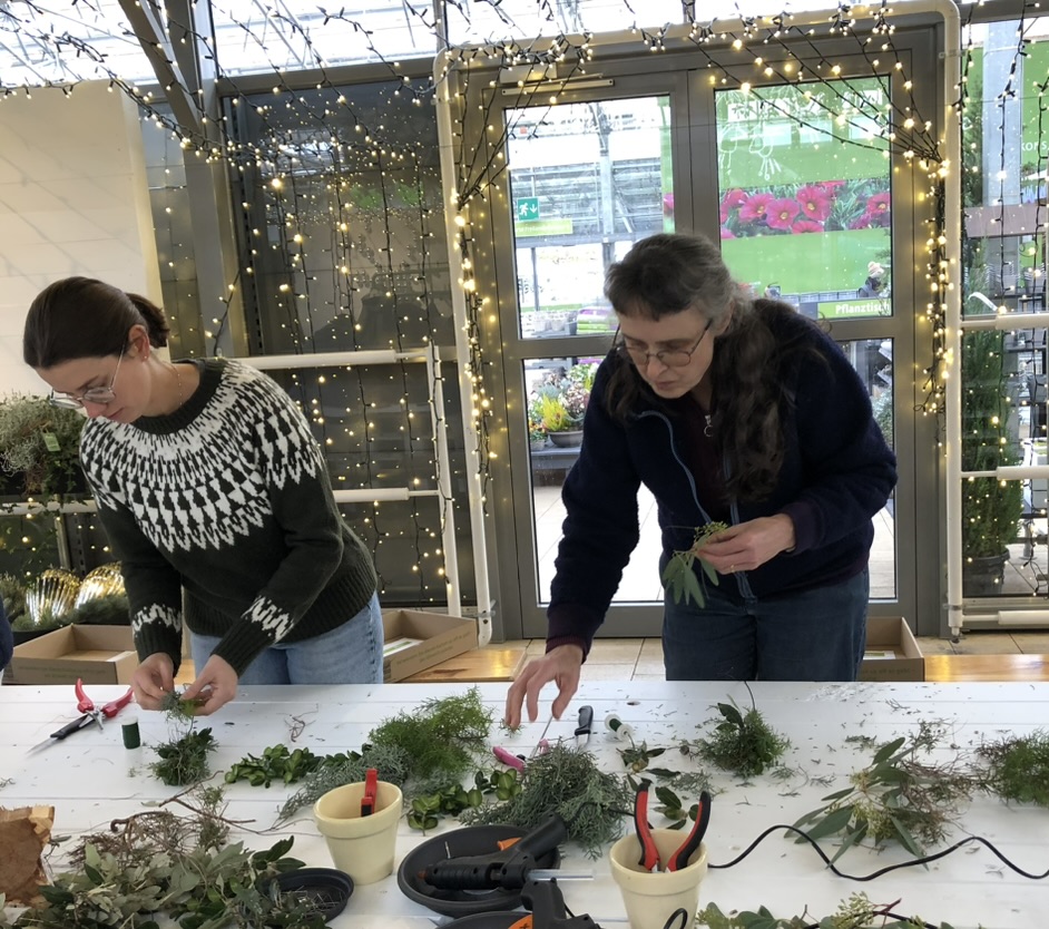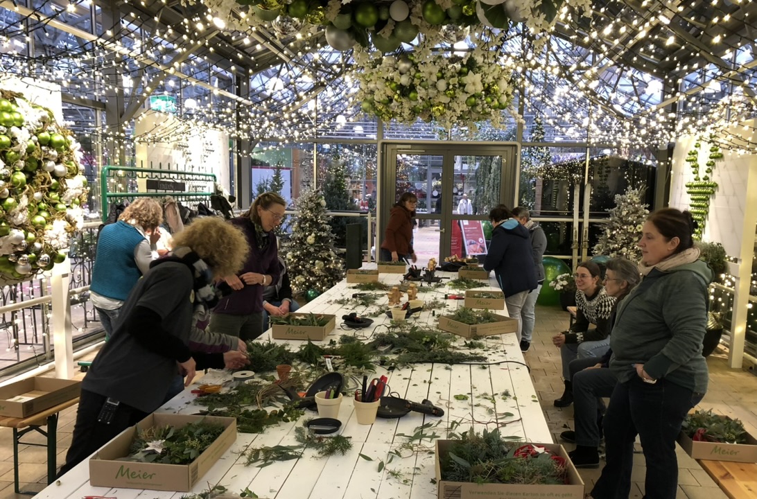Am Nachmittag ging es weiter ins Gartencenter Meier, wo uns eine Floristin in ihrer Adventswerkstatt empfing. Aus liebevoll bereitgestelltem Material entstanden individuelle Türkränze und stimmungsvolle Windlichter.