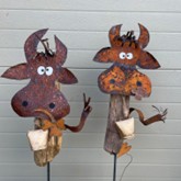 Ein Eisenständer mit einem montierten Holz bildet die Grundlage. Mit einer Blechschere schneiden wir einen Kuhkopf aus Rostblech aus, welcher anschließend mit lustigen Augen und einer Kuhglocke bestückt wird. Mit Herzen und Blumen wird die Stele fertig ausgeschmückt.